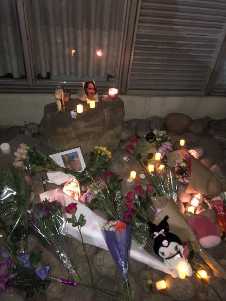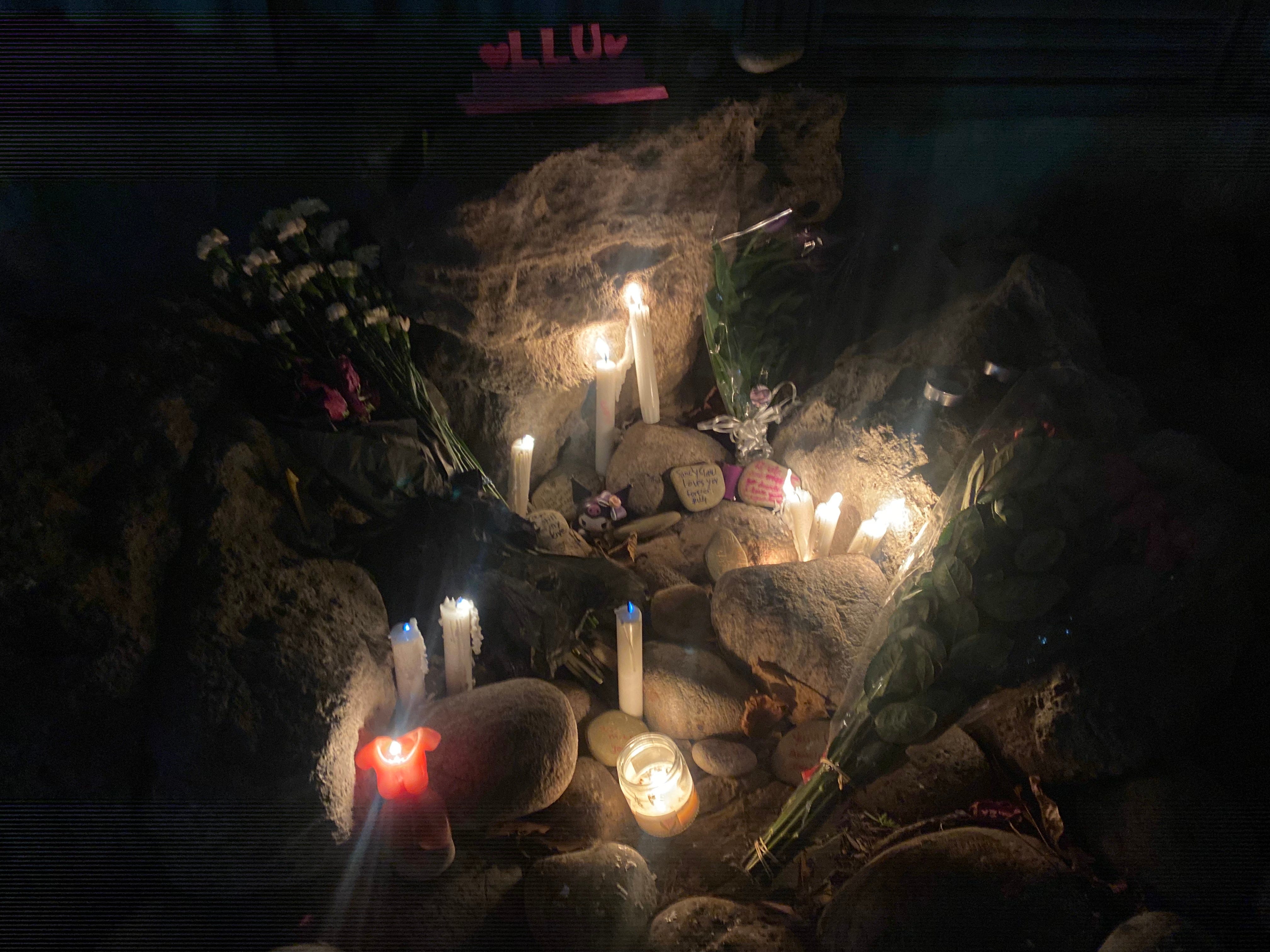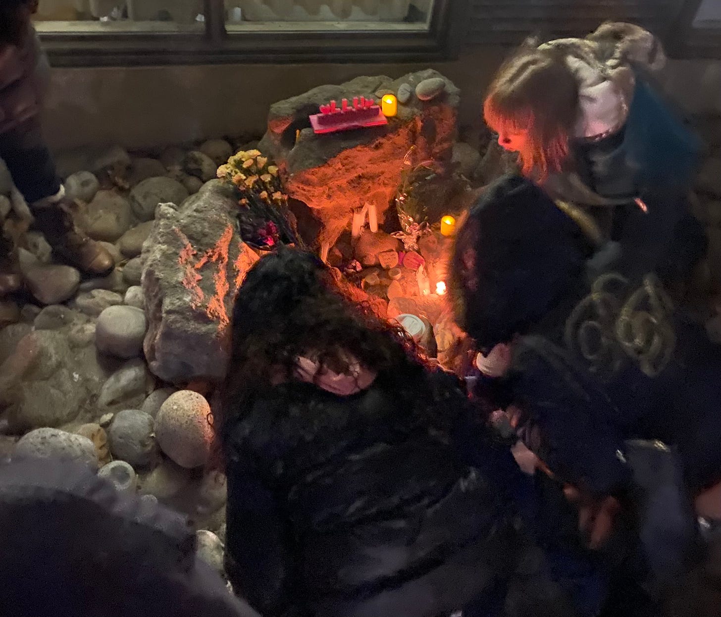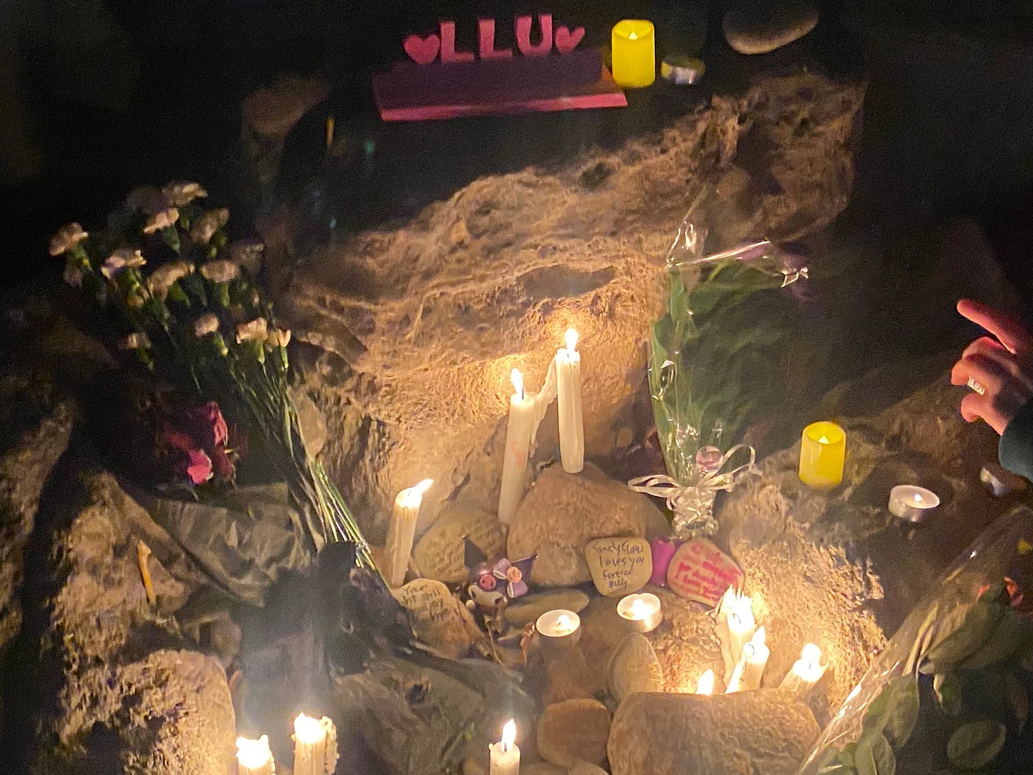 We lay photos and tokens and flowers and candles underneath the awning of the small apartment building where they found her. It was our first time in that space. That small corner of rocks tucked away behind hedges. A little nook. Her last little nook.