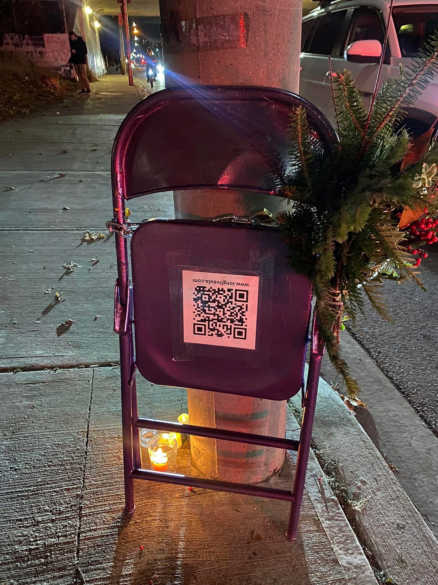 A purple chair chained to the post near her spot. To tell the those passerbys the story of my girl. To tell them that a sixteen year old girl died in front of them. That there is an epedemic on our hands that is killing our children. Our beautiful and cherished children.