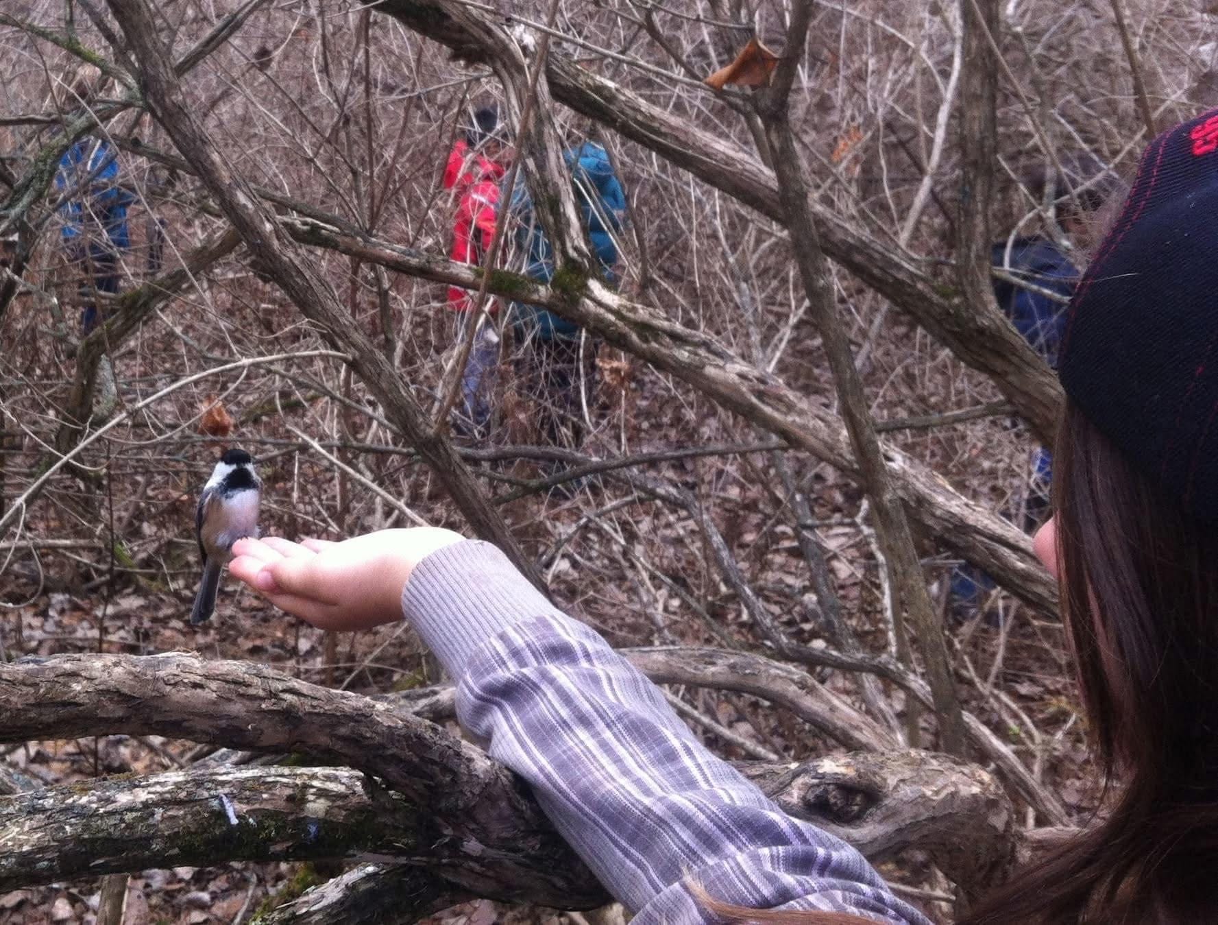 She had waited patiently for this little joyful bird to land. It came to her hand three times before stopping enough to feed from her palm. The third time did the trick.